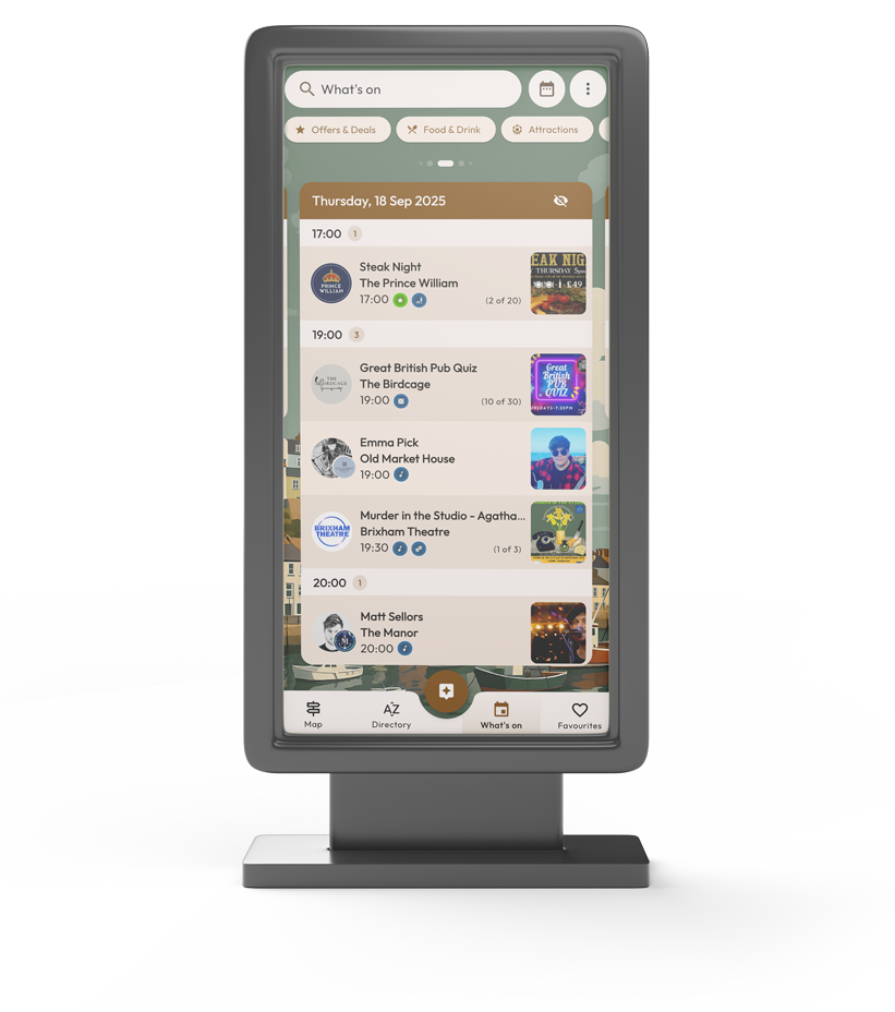 Display up-to-date event schedules, local listings, directions, and points of interest in real time—ensuring visitors always have access to the latest information.