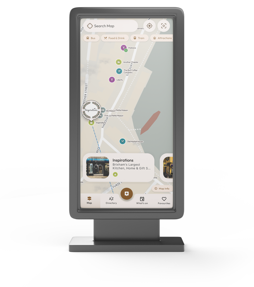 Large-format touchscreen kiosks naturally attract attention, increasing engagement and dwell time. Their bright, modern design ensures visitors immediately recognise them as a source of useful information.